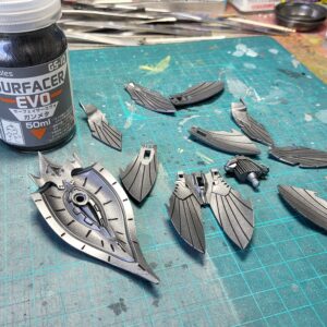 ・サーフェーサー:ガンメタリック系をエアブラシで吹き付け、面のウネりチェック。