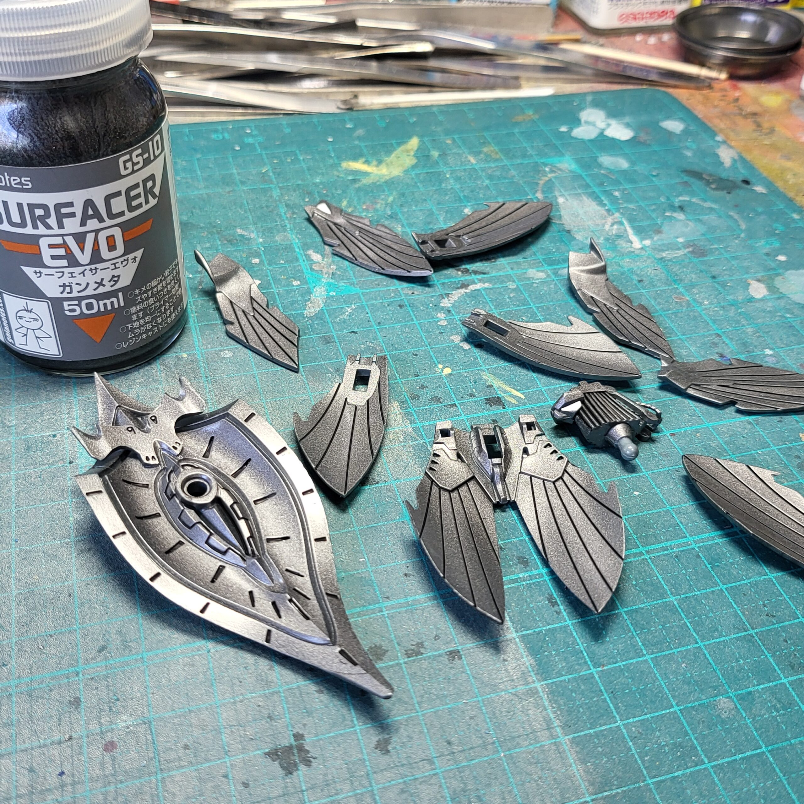 ・サーフェーサー:ガンメタリック系をエアブラシで吹き付け、面のウネりチェック。