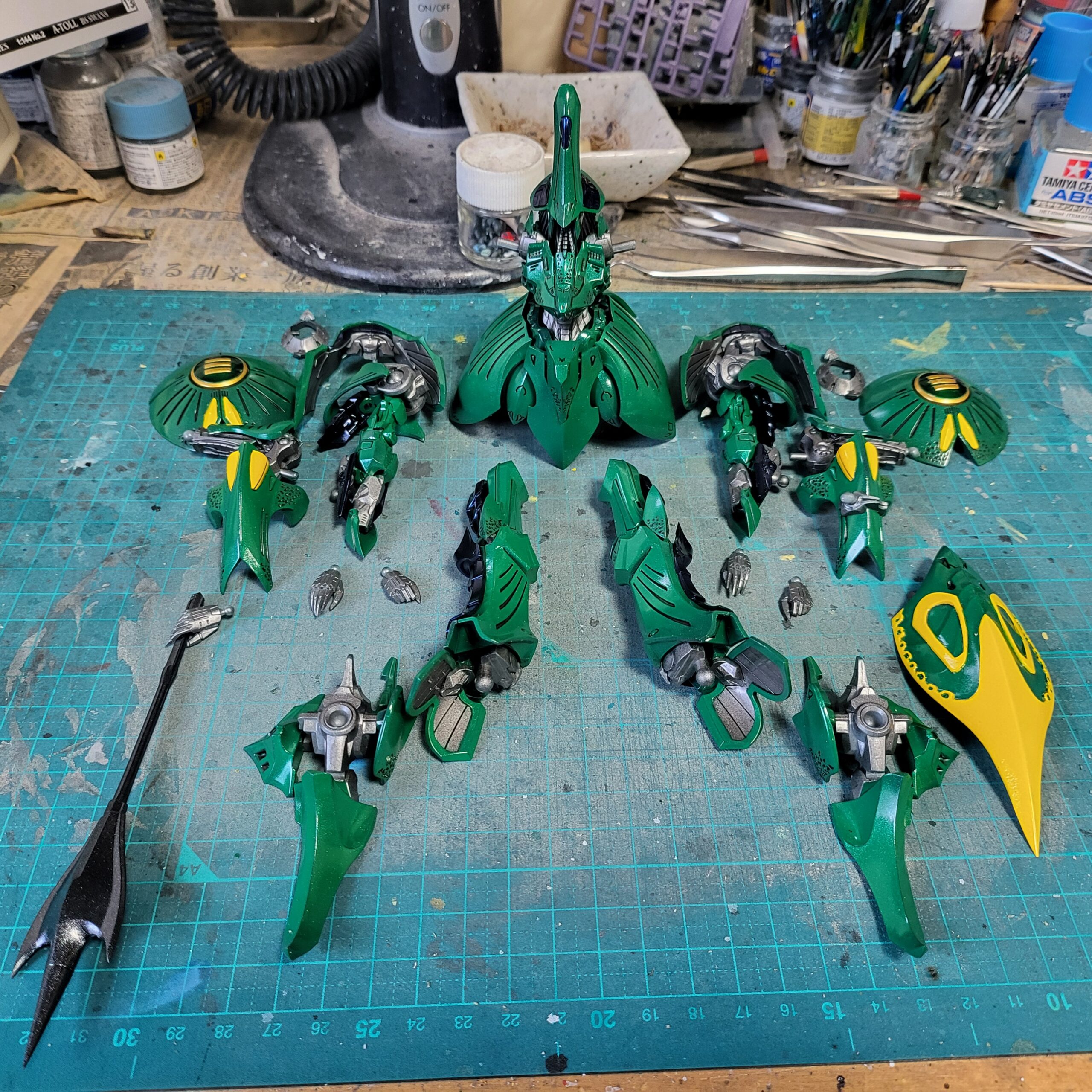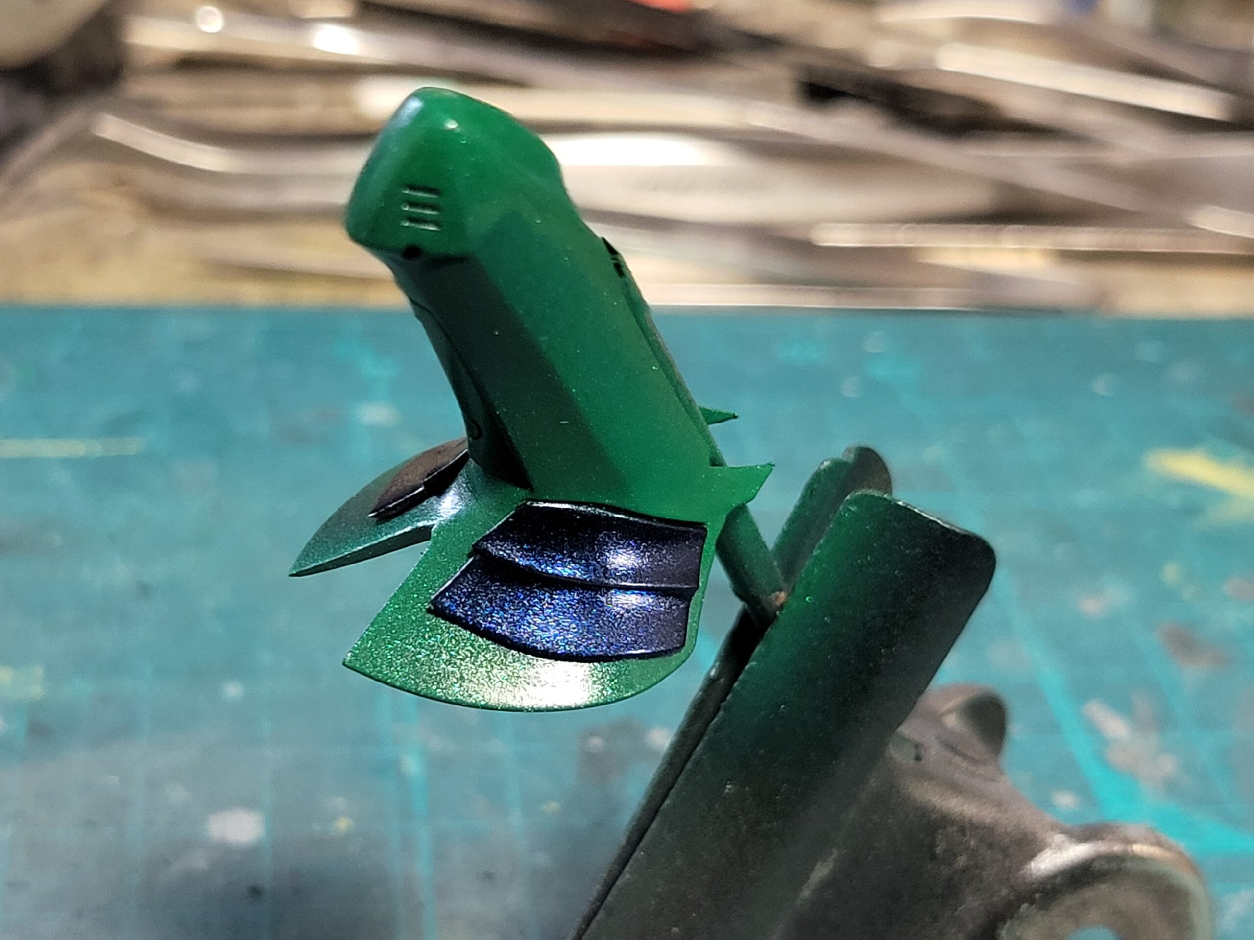 ・EX-ブラック(下地)→モウリーグリーン→パール:ターコイズグリーン→クリア×3 → 最後にスミ入れで彫刻感を強調