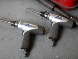 これまでは狭いところは錆落とし用のハンマーで殴って、広いところは上に写ってる棒のようなエアーケレン道具を使ってました。