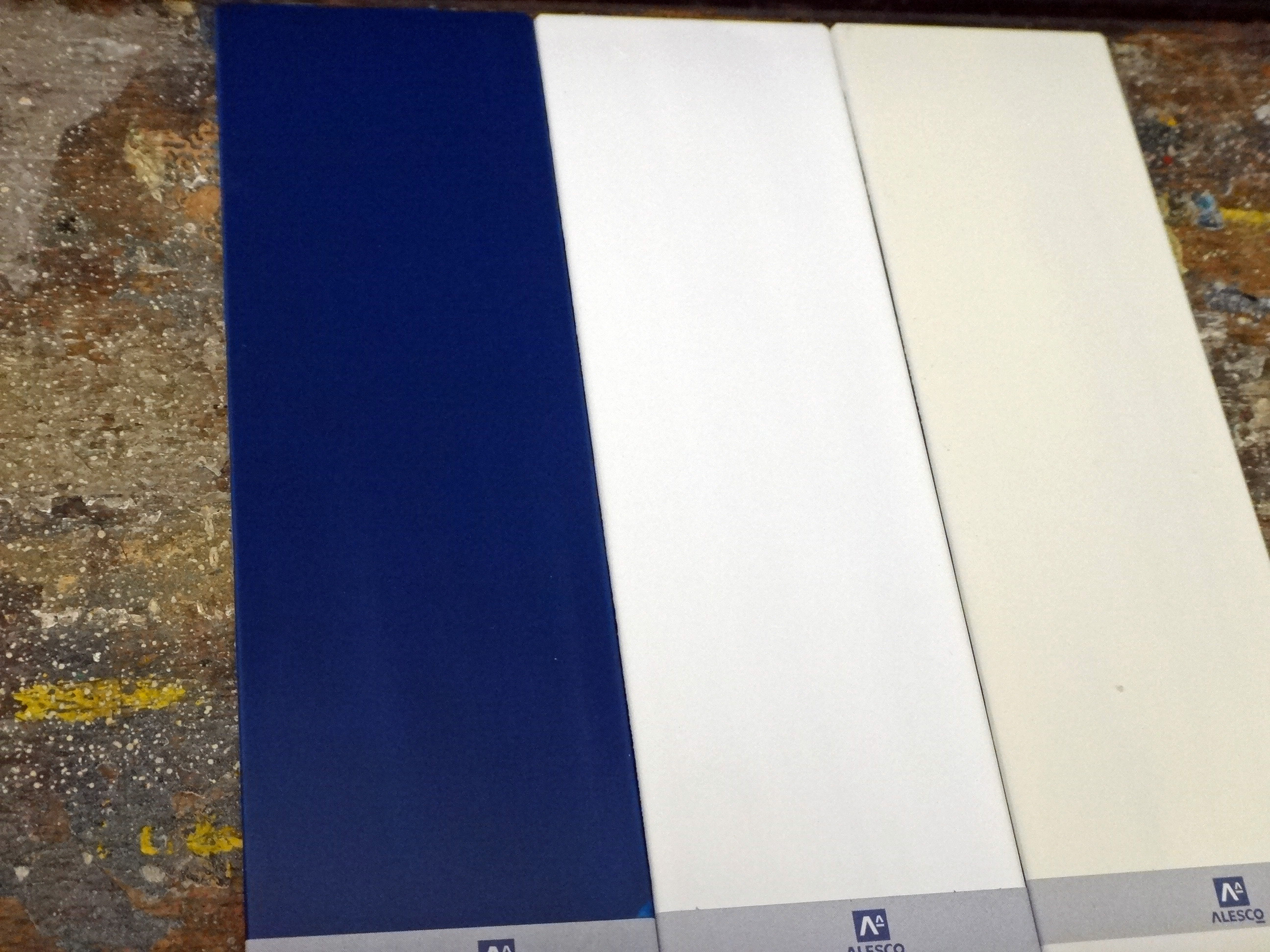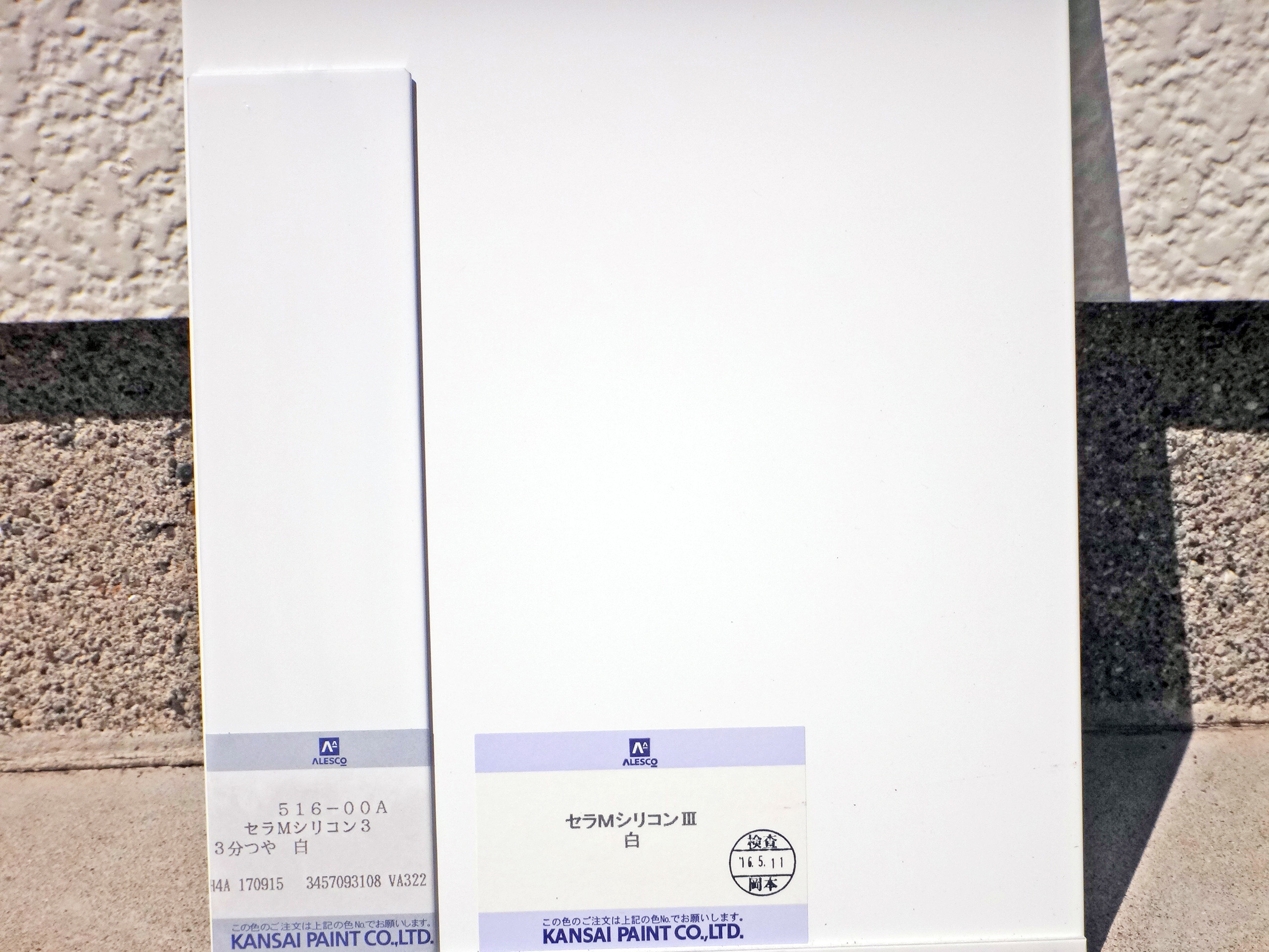関西ペイントさんは調色で発注すると色見本を付けてくれるので、ちょうど以前同じ塗料で作った塗り板と艶を見比べれる!