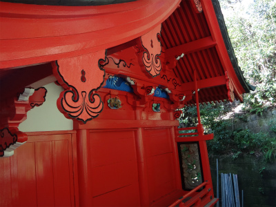 海南神社塗装修繕、最後は床を洗浄し金色や細部の色分けを行なったら足場を外して完工。