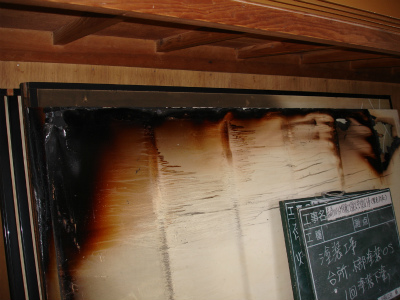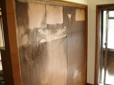 現場はひどく燃えたわけではないのですが、火元近くにあった襖は焦げてました。